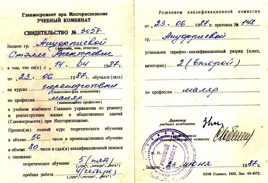 Тем не менее, она ухватилась за идею – заработать собственную квартиру. Срочно окончила курсы моляров-штукатуров. Прошла практику – в помещениях старых домов штукатурила стены. Получила корочки.