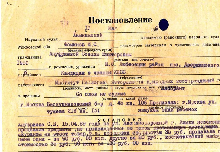 Стэлла по своему характеру всегда была экстравагантной и энергичной. Глядя на Юру, она тоже пробовала добыть денег на перепродаже дефицитных вещей. У Юры эта деятельность получалась лучше.
