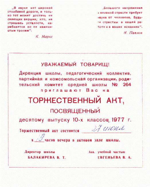 ЗДРАВСТВУЙТЕ, ДОРОГОЙ ПАПА И ДЕДУШКА!……Эля сдаёт на аттестат зрелости – пока все четвёрки, пятёрки. Ещё два экзамена. 28-го июня – выпускной вечер. Мы уже сшили ей выпускное платье в ателье, а мои мама с папой подарили белые танкетки……