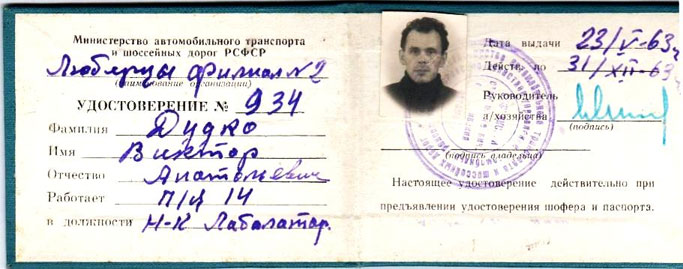 Удостоверение выдано Министерством автомобильного транспорта и шоссейных дорог РСФСР на срок с 23.06.1963 по 31.12. 1963 года.