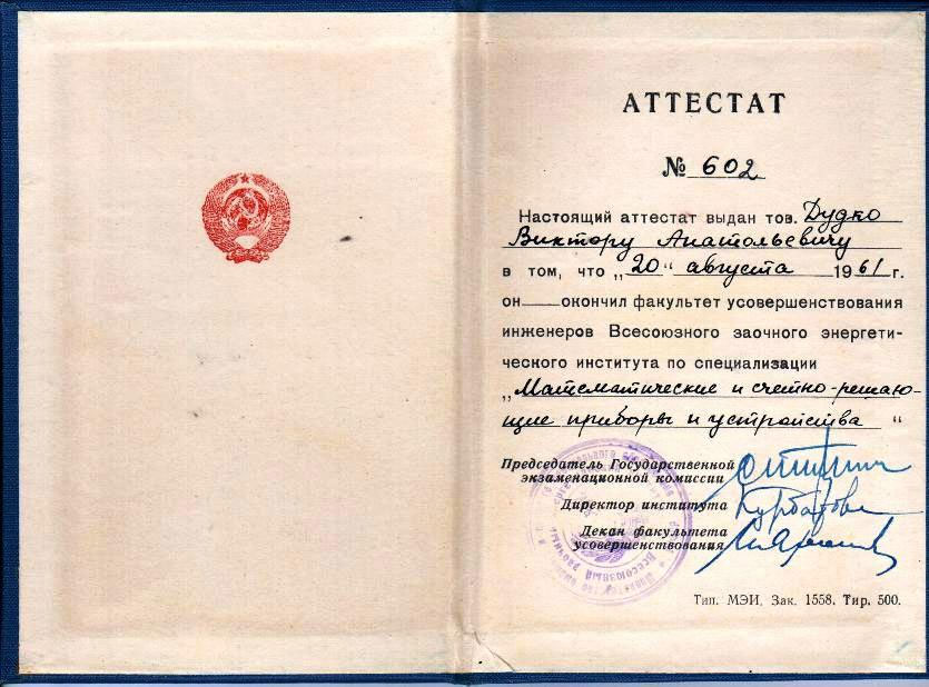 Когда я публиковала книгу о событиях 1961 года, в ней было упоминание о том, что Виктор окончил в том году факультет усовершенствования инженеров Всесоюзного заочного энергетического института по специальности – Математические и счётно-решающие приборы и устройства»
