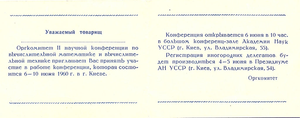 Нашла приглашение на II научную конференцию по вычислительной математике и вычислительной технике, которая состоялась 6–10 июня 1960 года в городе Киеве.