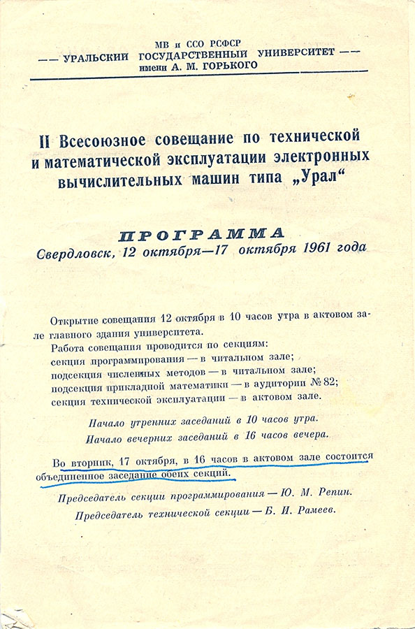 В этом году пришло приглашение из Свердловск на II Всесоюзное совещание по технической и математической эксплуатации электронных вычислительных машин типа «Урал». На конференцию направили меня.