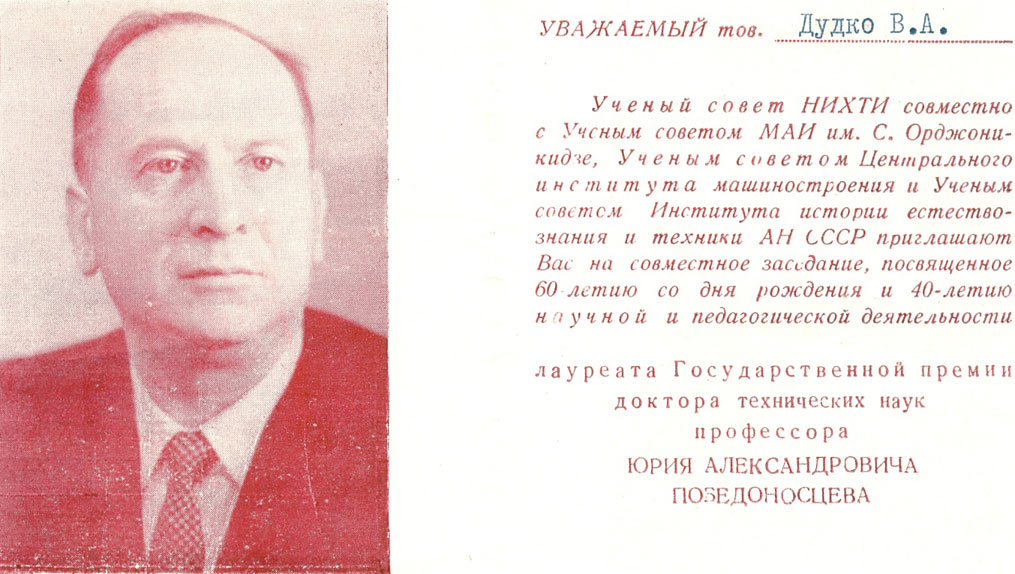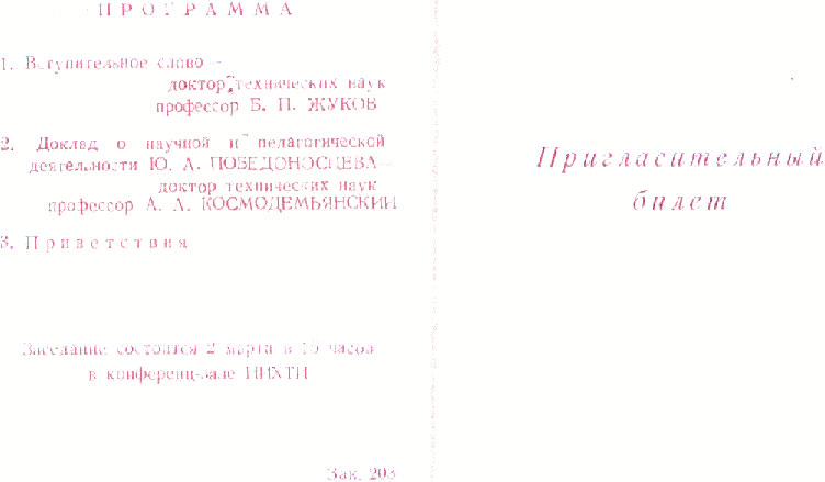 Учёным советом Центрального института машиностроения и Учёным советом Института истории естествознания и техника АН СССР приглашает Вас на совместное заседание, посвященное 60-летию со дня рождения и 40-летию научной и педагогической деятельности –