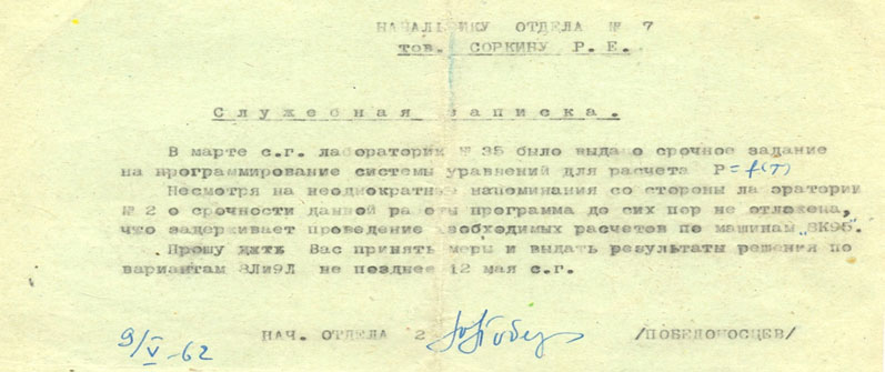 9.05. 62 г. Начальник отдела № 2 /ПОБЕДОНОСЦЕВ/Вот так у меня сохранился «автограф» ПОБЕДОНОСЦЕВА, хотя и на такой, не совсем лестной, служебной записке.