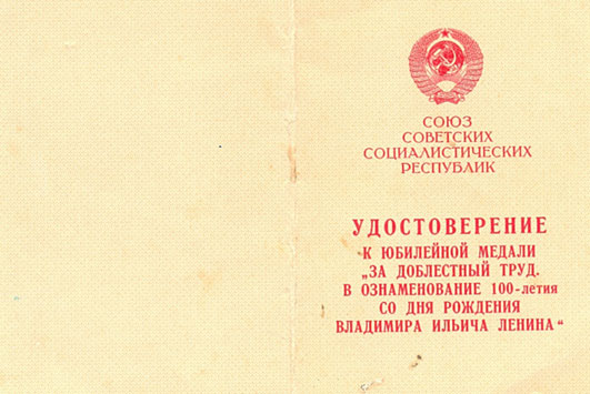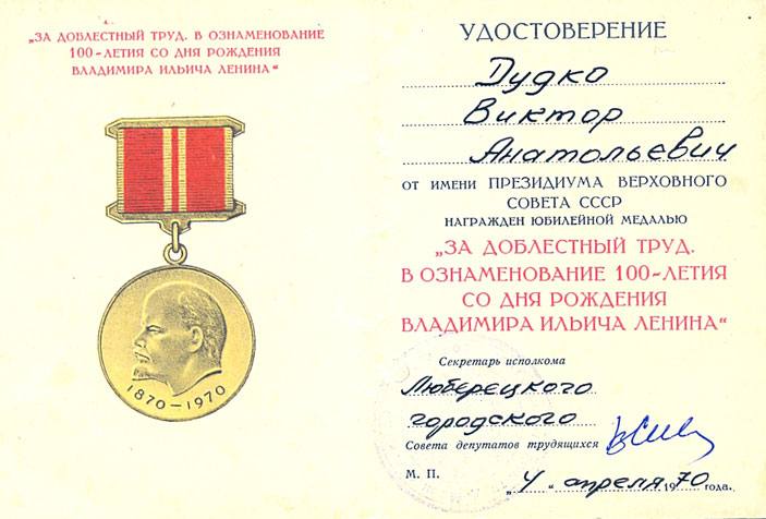 В начале года нас собрал Р. Е. Соркин и объявил, что на отдел выделено столько-то медалей в честь 100-летнего юбилея со дня рождения В. И. Ленина. На каждую лабораторию выпало столько-то медалей. Нам досталось две или три, и я включил В. Т. Иванькову и Андрееву В. П. и, кажется Иванову Н. П., а себя я не включал. Поэтому, когда потом мне вручили медаль – я был приятно удивлён.