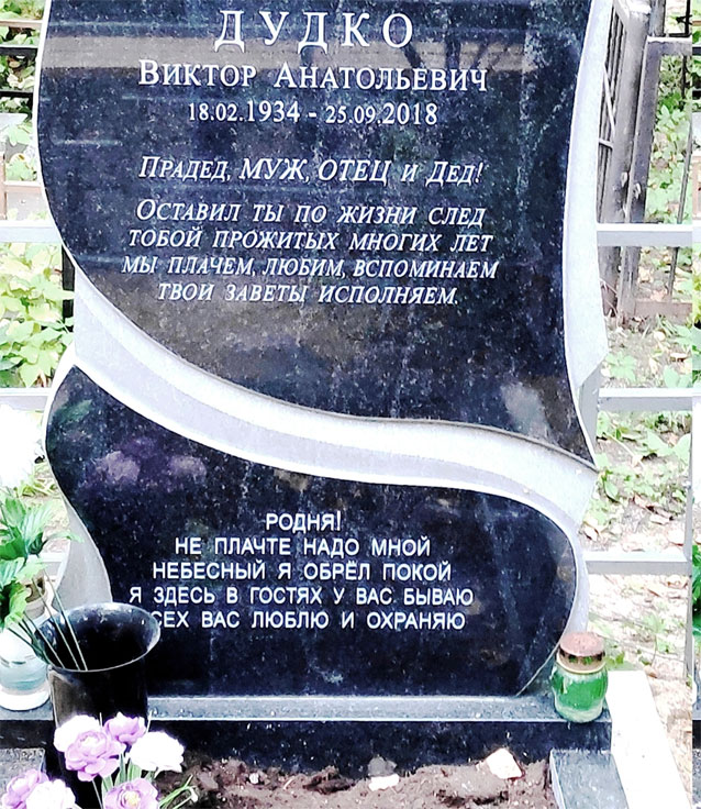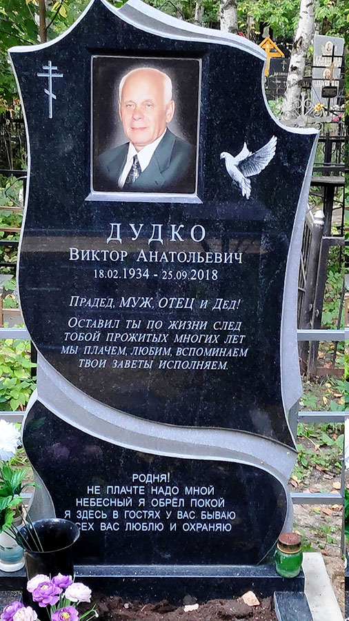 25 сентября 2019 года исполнился год, как умер Виктор Анатольевич Дудко. Чтобы больше в последующих книгах не возвращаться к теме памятников, после долгих колебаний помещаю здесь установленный памятник на могиле Виктора в Долгопрудном. Тем более, что в предыдущих публикациях подробно упоминалась история надписи на этом памятнике.