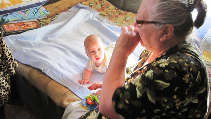 Наш правнук смотрит, как голуби клюют – насыпаное для них на краю дороги пшено.