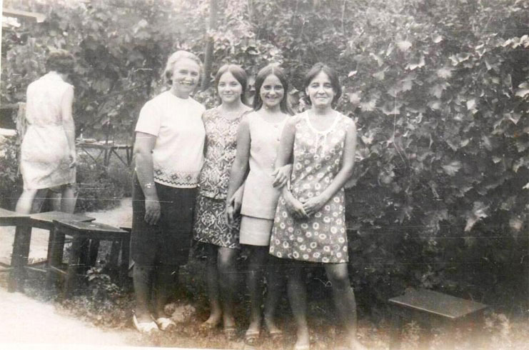 На снимке – тётя Таня (жена дяди Пети – брата отца Виктора), и три их дочки: (Наташа, Таня и Галя). А слева – Вика Макаровец…