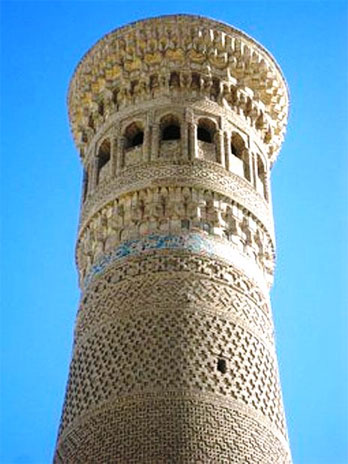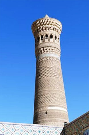 Минарет Калян – главный символ Бухары и её архитектурная доминанта. Построен из жжёного кирпича усто Бако по заказу караханидского правителя Арслан-хана. Высота – 46,5 метров, диаметр у цоколя – 9 метров. Украшен 12 декоративными поясами геометрических и эпиграфических узоров.
