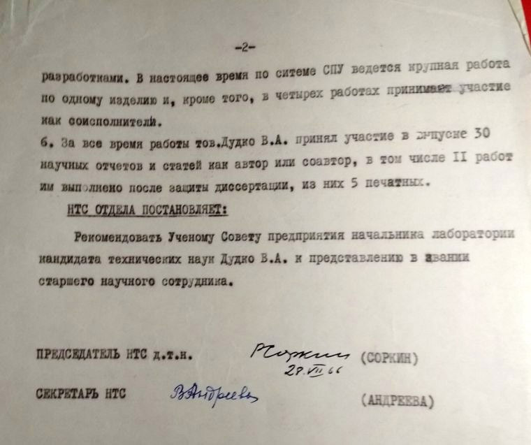 Утвердить решение Учёного Совета предприятия п / я № 14 от 10 февраля 1966 года об избрании начальника лаборатории № 35 кандидата технических наук тов. Дудко Виктора Анатольевича на замещение вышеупомянутой должности (по конкурсу).