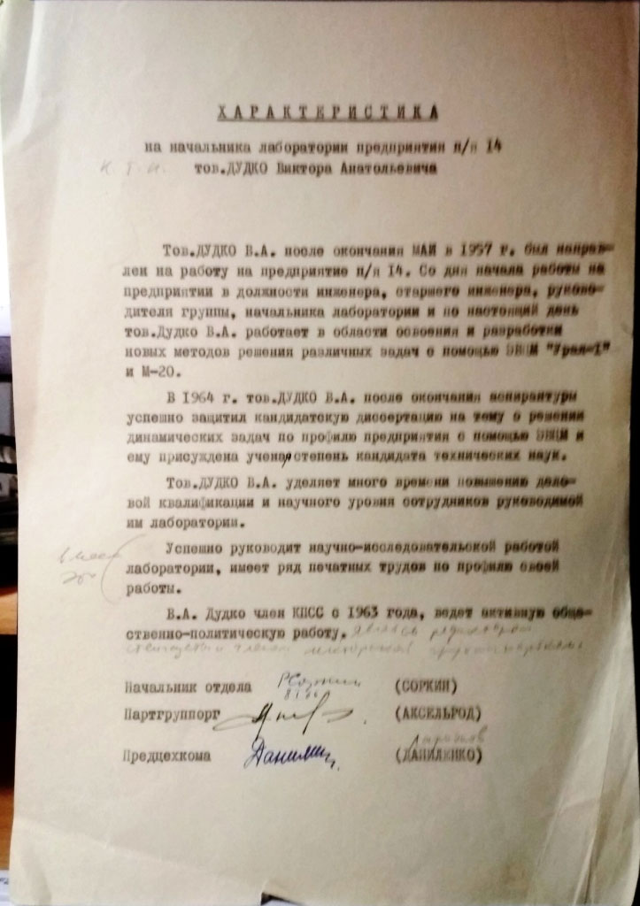 Тов. Дудко В. А. после окончания МАИ в 1957 году был направлен на работу на п/я 14. Со дня начала работы на предприятии в должности инженера, старшего инженера, руководителя группы, начальника лаборатории, и по настоящий день тов. Дудко В. А. работает в области освоения и разработки новых методов решения различных задач с помощью ЭВЦМ «УРАЛ – 1» и «М-20».