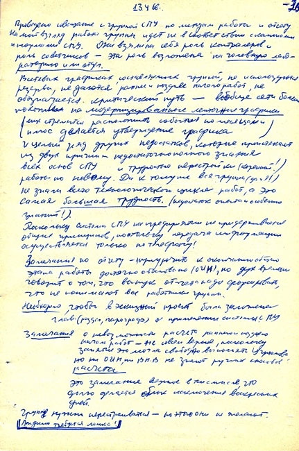 Проведено совещание с группой СПУ по методам работы и отчёту. На мой взгляд, работа группы идёт не в соответствии с канонами и нормами СПУ. Они взяли на себя роль контролёров и роль советчиков – эта роль возложена на головную лабораторию или отдел.
