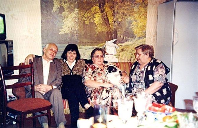 На фотографии: Виктор, Стэлла, Я (Ираида) и Екатерина Митрофановна – в нашей квартире в Отрадном. Юра фотографировал. У меня на руках – Капитолина, или просто Капа – дочка Леди…