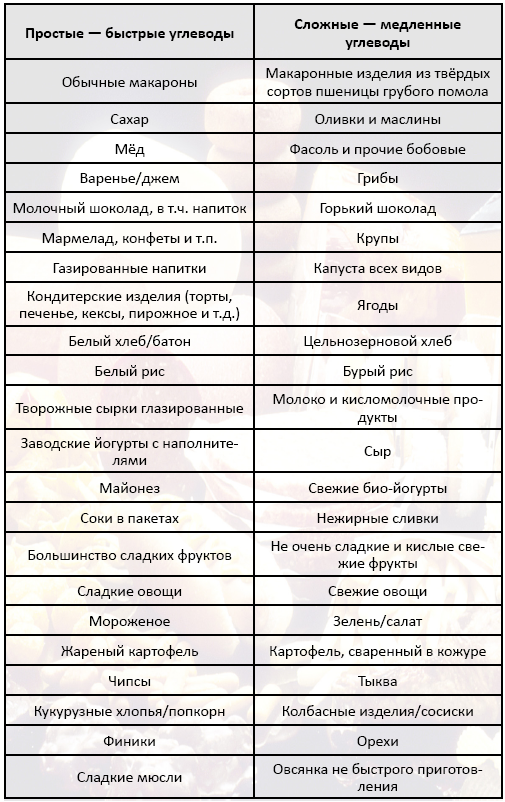 И конечно, это далеко не полный, но основной список. Однако поскольку мы всё-таки не делаем акцент на полном избавлении от всего вкусного из колонки слева, потому что справляться с этим поможет масло тмина, то зацикливаться на высчитывании гликемического индекса не стоит. Просто возьмите за правило: начиная часов с 5–6 вечера не объедаться этими продуктами. Далее подробно объясняется, почему ночью глюкозы в крови должно быть мало.