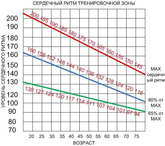 Если нагрузка подразумевает продолжительную, низко интенсивную кардиоработу, то мы называем ее аэробной. Этот красивый термин означает, что для обеспечения работающих мышц энергией необходим кислород. К аэробным нагрузкам относят бег трусцой, плавание, ходьбу, катание на велосипеде и другие похожие нагрузки. Если вы занимаетесь в зале, то синонимом аэробных нагрузок для вас будет работа на кардио тренажерах на пульсе, значительно ниже вашего анаэробного порога (линия, отмеченная на графике зеленым цветом) и зависящая от возраста. При не возможности измерить пульс, есть простой способ убедиться в том, что уровень нагрузки вам подходит – "разговорный тест"; если вы дышите слишком тяжело, чтобы поддерживать разговор с партнёром (или с самим собой) – значит интенсивность упражнения выше рекомендованной. А если вы можете пропеть несколько строк без одышки, то нагрузка слишком лёгкая [3], стр.11.