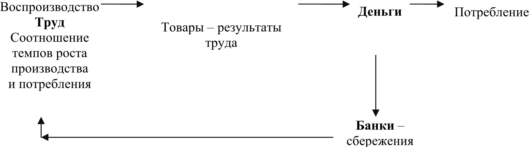 Между тем в самой природе производства и потребления есть условия, которые диктуют неизбежность развития теории денег. Как образно выразился английский экономист ХХ в. Джон Кейнс: «Значение денег прямо проистекает из того факта, что они являются связующим звеном между настоящим и будущим» [23]. Разумеется, основными производителями денежных сбережений являются предприятия, домашние хозяйства, которые часть своих денежных доходов от трудовой деятельности используют на потребление, а другую часть оставляют в банках на покрытие будущих расходов, т. е. сберегают (рис. 1.1).