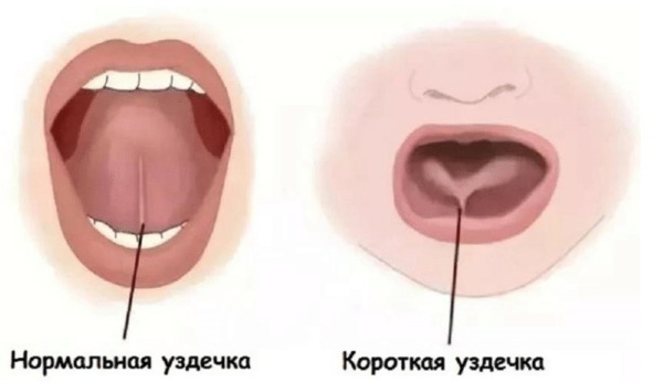 Уздечка языка выглядит как жгутик под языком, соединяющий его нижнюю поверхность с дном ротовой полости. При её недостаточной длине ребёнок не может правильно произносить звуки, требующие подъема языка (шипящие и звуки [р], [л]).