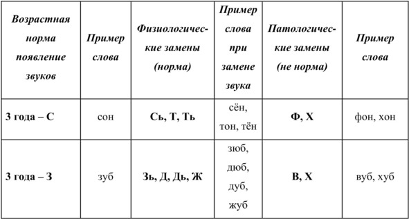 До трёх лет возрастной нормой считается смягчение согласных звуков («сяпка» вместо «шапка», «дём» вместо «дом» и т. д.). Все остальные звуки малыш в этом возрасте, как правило, не произносит совсем (пропускает) или заменяет на более простые (вместо «мишка» ребёнок может произносить «мика», «миска», «миська»).