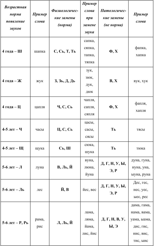 К 5—6 годам ребёнок должен овладеть правильным произношением всех звуков речи. Задержка в своевременном появлении звуков говорит о том, что существуют особые причины, мешающие ребёнку самостоятельно овладеть звуками. Нарушения, недостатки, дефекты произношения требуют специальной логопедической помощи.