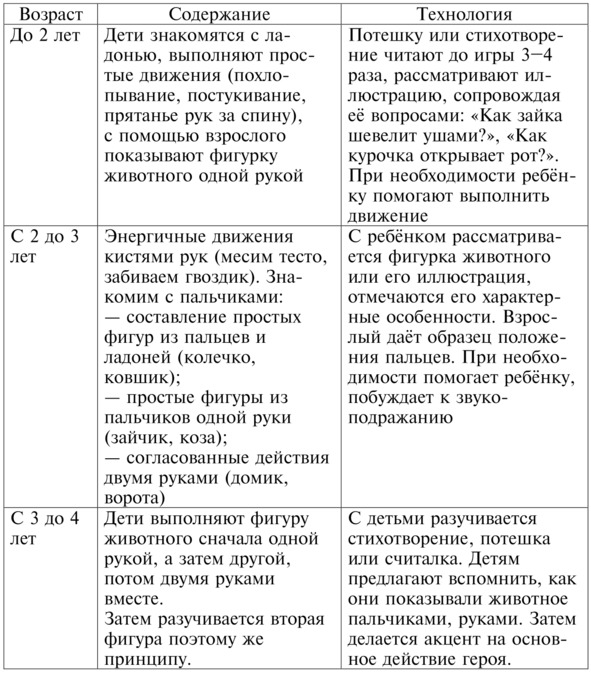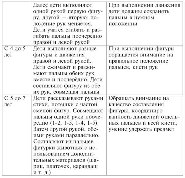 Приведённая ниже таблица поможет чётко спланировать работу с детьми разного дошкольного возраста в обучении пальчиковым играм.