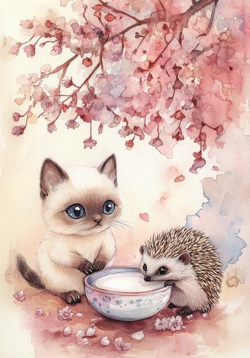Поранившись о колючки, кот отошёл в сторону, а ёж принялся лакать молоко из миски. Мне даже стало жаль пушистого, он так обиженно смотрел, как исчезает его обед… Но вдруг Антошка отодвинулся, словно приглашая того к миске. Кот опасливо подошёл и тоже начал лакать.