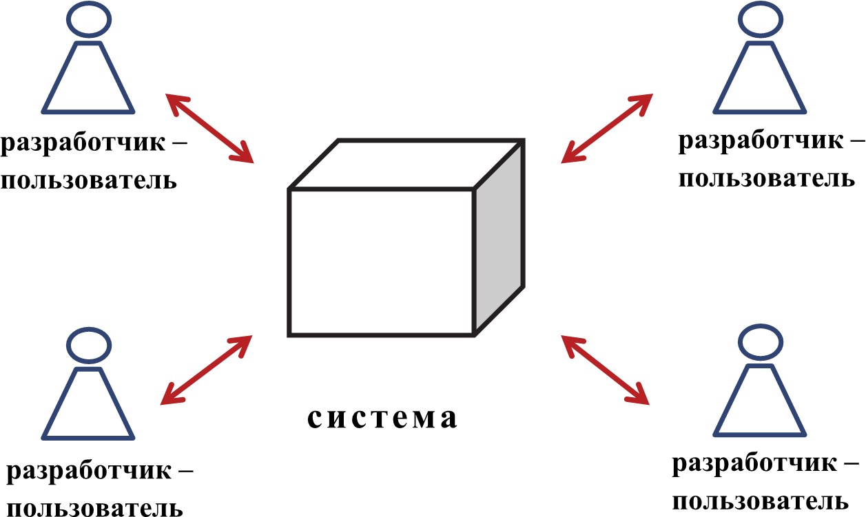Существует две стратегии разработки и организации систем: процедурная и проективная. Процедурная стратегия предполагает принцип «один для многих» (по аналогии с отношением «один ко многим» в реляционной модели данных), т. е. кто-то создает систему для других на основе завершенного проекта. Для исполнения (реализации) проекта обычно привлекается ограниченный круг участников проекта. При этом система может видоизменяться лишь по заданной разработчиком процедуре, она закрыта для вмешательства извне (рис. 1).