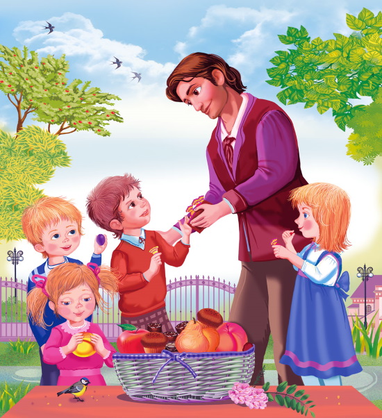 Детишки бросились навстречу Никону, шлёпая по лужам. Никон поставил большую корзину с лакомствами на скамейку, и малыши стали набивать карманы конфетами, печеньем, цукатами и фруктами.