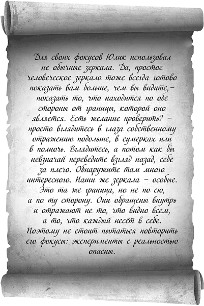 Явился тот самый коренастый, который вносил ящики с книгами, и вкатил большое, в рост человека, завешанное чёрным шёлком зеркало. Юлик смахнул шёлк, ткань порхнула через освещённое пространство врановым крылом. Старое, помутневшее стекло в тяжёлой раме отразило проход меж стеллажами мрачно и тускло. Прожектор притушили.