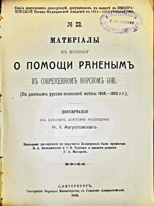 Большая удача нашего альманаха в том, что организационном центре книги среди ряда исторических документов стоит диссертация порт-артурца, участника русско-японской войны, врача эскадренного броненосца «Пересвет» Н.И.Августовского. Один из оттисков диссертации Августовского (капитальный труд, 200 страниц, 5 авторских листов) «О помощи раненым в современном морском бою (по данным русско-японской войны 1904—1905 гг.» хранится в Кронштадтском военно-морском госпитале (35-м ВМГ) и приводится в альманахе с разрешения командования (возможно, впервые с 1912 г.).