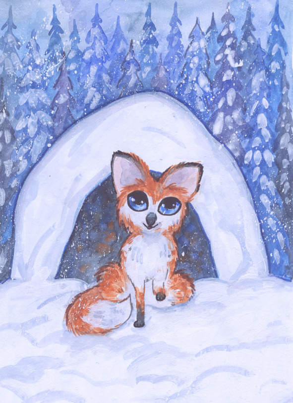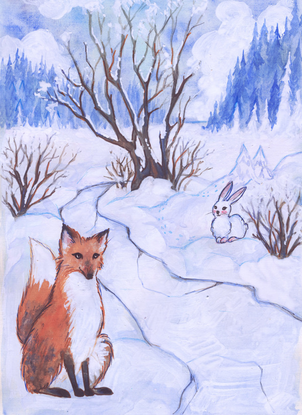 Зимняя картина – чистый снег кругом.Он лежит на ветках праздничным платком.Лес в сугробах белых точно утонул.Все уже готовы долго ждать весну.Онемела речка, спящей притвориласьИ от злого ветра льдом давно укрылась.На лесной опушке чёткий зайца след,А его не видно – он переодет!Рыженькая шубка – на лисе обновка.У зимы особая для этого сноровка.