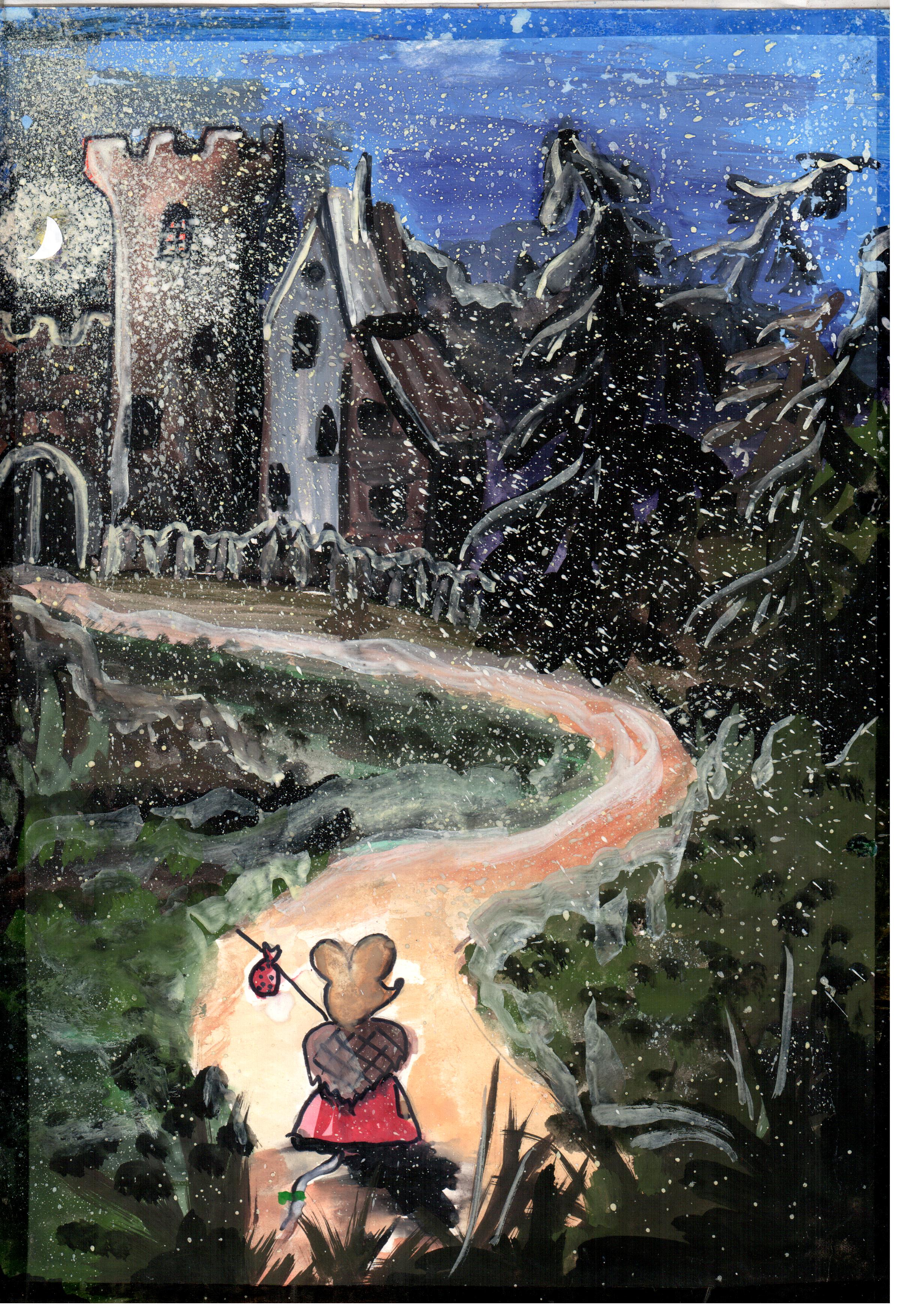 Однажды Фантик пригласил соседей-мышей на День рождения. Бусинку тоже. Она долго думала, перебирая сундучки. Что же подарить своему лучшему другу. Но ничего подходящего для Фантика в её дамской коллекции не нашлось. Тогда она решила ещё раз сходить на раскопки и непременно найти что-нибудь подходящее для подарка. Долго бродила мышка по знакомым чуланам, но её поиски были напрасны. Незаметно подкралась ночь и стало совсем темно. Путешественница попала на окраину города, где ещё ни разу не была. Здесь в старом заброшенном замке жила колдунья Клара, и все избегали этого места. Но мышка решила посетить этот замок, так как это было единственное место, куда она ещё не заглядывала.