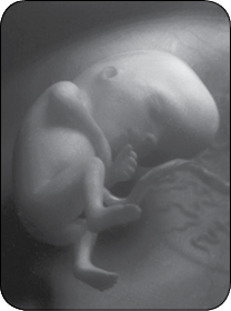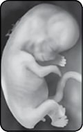 Головка и шея выпрямляются (раньше подбородок был прижат к шейке). Размер головки становится пропорциональным размеру туловища, т. к. тельце интенсивно растет в длину. Бровки и реснички подросли. Происходит закладка постоянных зубов. Нервные волокна, расположенные по всему телу малыша, постепенно покрываются защитным веществом (миелином). Малыш сосет пальчик. Длина тельца 13–17 см, масса тела – 120–150 г.