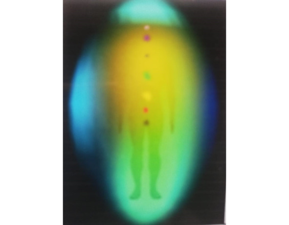 В идеале аура имеет круглую гармоничную и сбалансированную форму. В ауре могут просматриваться пятна, дыры или другие выделяющиеся области, и их цвета можно соотнести с функциями органов, частей тела. Если мы посмотрим на фото (аура жёлтого цвета), то заметим вокруг плеч человека жёлто-коричневые пятна. Это может свидетельствовать о том, что у него есть проблемы в воротниковой зоне или в области горла.