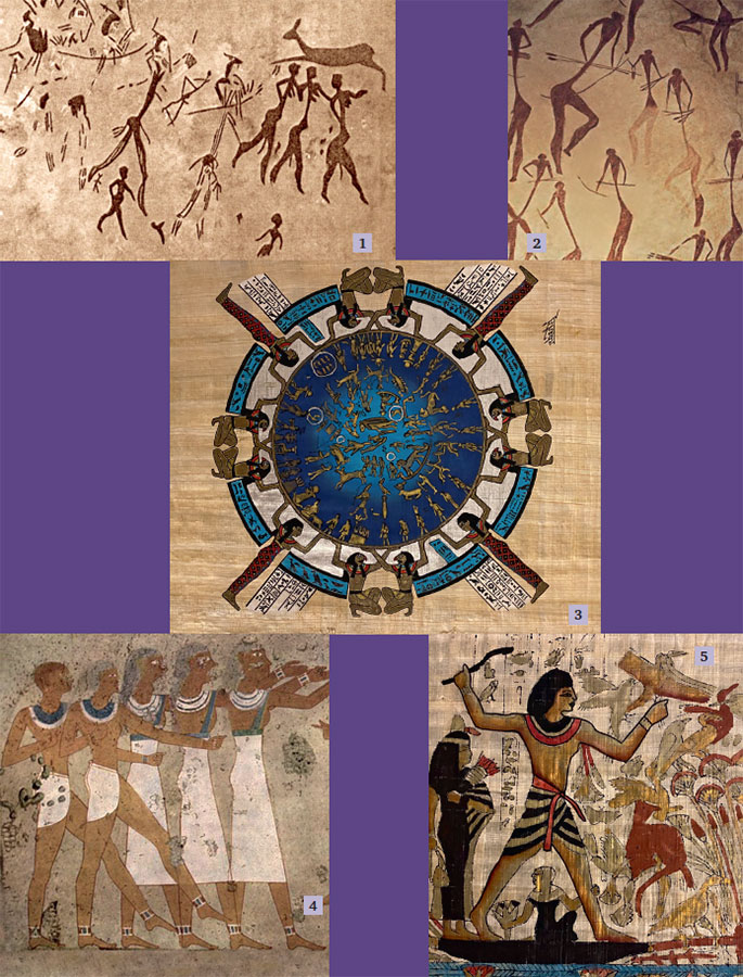 1, 2 – танец первобытного человека; 3, 4 – танец в Древнем Египте; 5 – охота фараона.