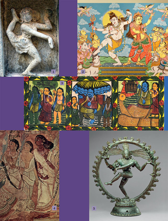 1 – храмовая танцовщица; 2, 5 – танец бога Шивы; 3 – сцена из индийских мифов и сказаний; 4 – индийские танцовщицы на празднике.