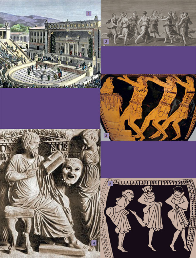 1, 4 – театр в Древней Греции; 2 – бог Аполлон и музы; 3, 5 – танец древних греков.
