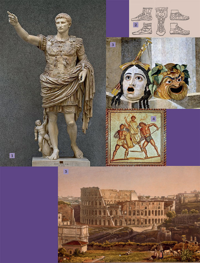1 – император Октавиан Август; 2 – обувь в Древнем Риме; 3 – театральные маски; 4 – бой гладиаторов; 5 – Колизей.