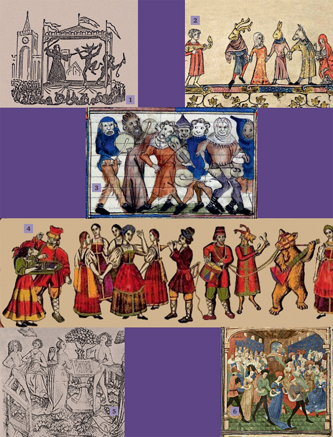 1 – представление перед собором; 2, 3, 5, 6 – танец в Раннем Средневековье; 4 – скоморохи на Руси.