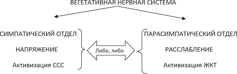 Дело в том, что у человека есть отдел нервной системы – вегетативная нервная система. Расскажу о ней очень упрощенно. Вегетативная нервная система у среднего человека работает в обход воли человека, контролируя работу органов и систем. Конечно, некоторые люди, типа йогов, усиленно тренируясь с помощью специальных техник могут научиться, например, менять сердечный ритм. Она, в свою очередь, делится на симпатический и парасимпатический отделы. Симпатический отдел отвечает за мобилизацию организма на активную деятельность, усиление обмена веществ. Большей частью это происходит путём активизации сердечно-сосудистой системы (ССС). Парасимпатический отдел отвечает за восстановление и накопление энергии, в том числе и за счет питания и переваривания пищи, восстановление организма во время сна. И активизация парасимпатического отдела ведёт к активизации работы желудочно-кишечного тракта (ЖКТ). Парасимпатический и симпатический отделы не могут работать одновременно, только по очереди. Т. е. период расслабления не может совпадать с периодом напряжения: либо один, либо другой. Либо мы в напряжении, либо в расслаблении. Люди с вегето-сосудистой дистонией прекрасно это знают и пользуются таким способом расслабления интуитивно: если им становится нехорошо, появляется излишнее напряжение, они перекусывают и пьют сладкий чай, и им становится легче.