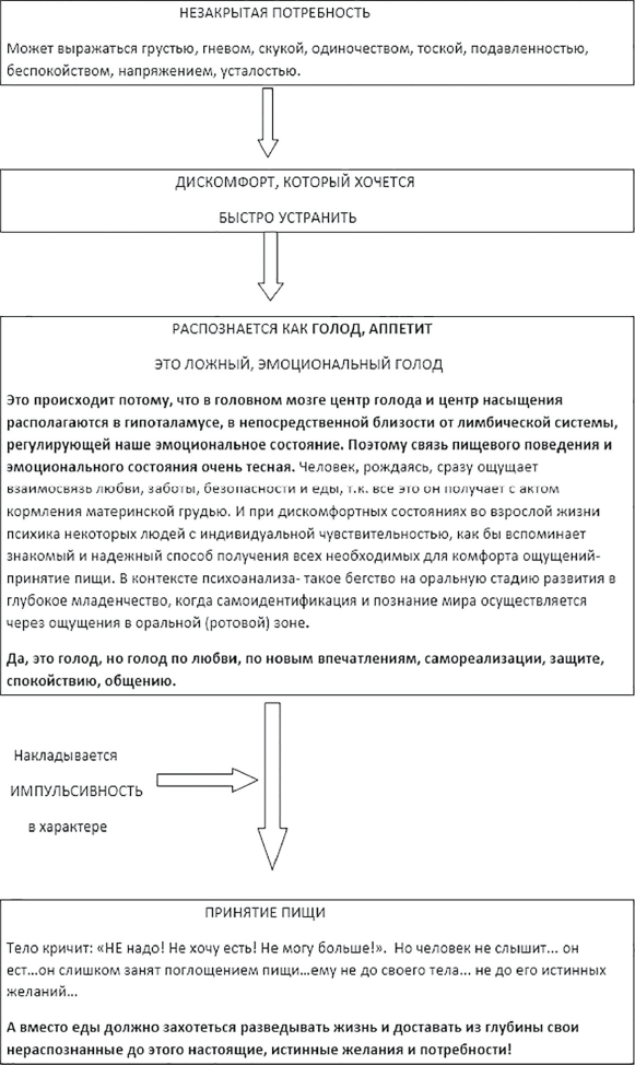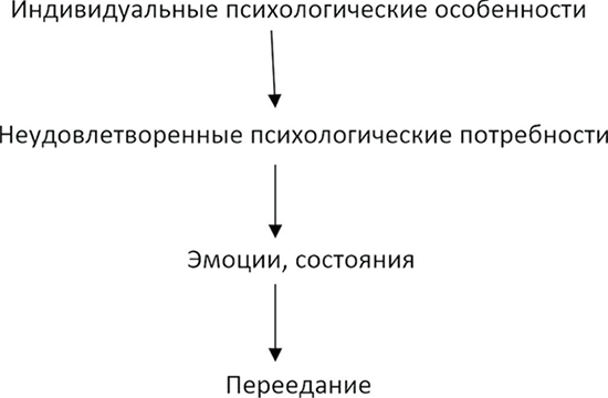 Неудовлетворённые психологические потребности человека ведут к регулярному возникновению определённых эмоций и состояний (чаще тоска, печаль, гнев, раздражение, одиночество, напряжение, усталость, беспокойство, подавленность). Часто эмоции остаются нераспознанными самим человеком, особенно если есть хронические депрессивные и тревожные состояния. Непосредственно под их влиянием человек переедает.