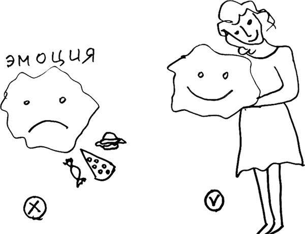 Комментарий к рисунку. Когда младенец плачет, мать не всегда понимает причину плача и даёт каждый раз еду. Младенец может и не хотел еду, может он хотел пообщаться, может и просто поэмоционировать, но он действительно может не отказаться от предлагаемой еды и начать есть, переключаясь со своего истинного желания. Появившейся у вас эмоции не обязательно начать предлагать еду! Может она появилась у вашей психики для того, чтобы вы её полюбили и приняли, просто провели с ней время!