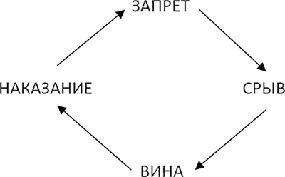 Запрет – это ограничения в питании, которые неизбежно заканчиваются перееданиями, срывом. За срывом по очереди идёт чувство вины, постдиетическая депрессия, плохое настроение, ненависть к себе. Затем следуют различные самонаказания, обещания себе сдерживаться в следующий раз, и наступает следующее ограничение в питании, запрет.