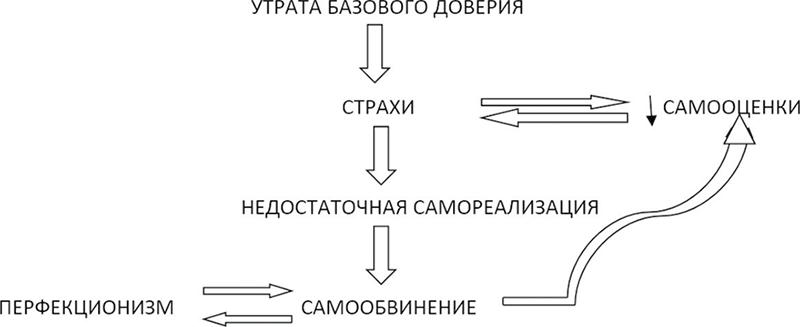 Самообвинение и страхи ведут к перфекционизму в виде завышенных требований к самому себе. Самообвинение еще больше снижает самооценку.
