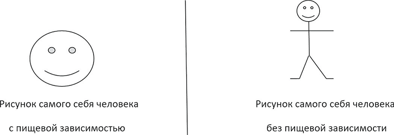 То есть, человек с пищевой зависимостью настолько отделяет свое тело от себя, что рисует только голову, хотя внешне, на поверхностном уровне, может уделять телу много «внимания»: различные пищевые системы и диеты, физические упражнения, направленное внимание телу в виде постоянного недовольства им всем и его отдельными частями, частые взвешивания на весах или целенаправленное избегание взвешиваний, часто смотрится в зеркало или избегание зеркал, и др.