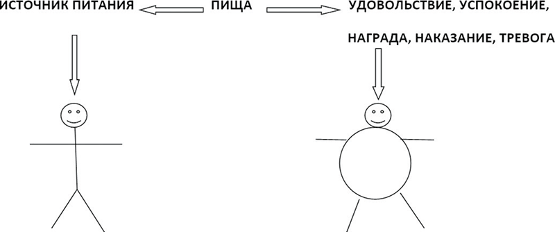 Постепенно из-за нарастающего недовольства своим телом происходит «дистанцирование» от него, разотождествление себя настоящего от этого «мерзкого жира». Чем больше подавленных эмоций удерживается в теле, тем больше человек хочет от него дистанцироваться. И, как следствие, нарушается способность слышать сигналы тела, в частности: сигналы физиологического голода и физиологического насыщения. А те формы физической активности, которые выбирает человек, не приносят ему радости, т. к. это не совпадает с желаниями его тела, сигналов которого он не слышит.