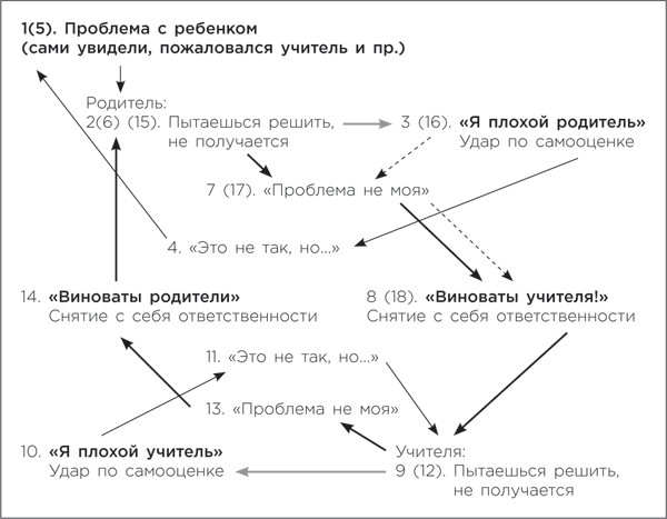 Вы идете в школу с вопросами о том, как быть в той или иной ситуации, приходите к профессионалам, имеющим высшее педагогическое образование. Вы хотите получить какие-то конкретные советы, «рецепты» по поводу трудностей в воспитании детей. И (поначалу!) большинство из вас действительно ищут помощи и надеются на нее. Однако чаще всего вам не сообщают ничего принципиально нового, действенного, поскольку советы вроде «вам надо наладить с ним контакт», «вы должны за ним следить», «вам надо с ним разговаривать», «вам надо стать с ним друзьями», «вы должны ему помочь» не несут в себе никакой практической пользы (потому что, как это сделать, вам не говорят!). И на отчаянный родительский крик о помощи «Наказывать? Наказывали! И телефона лишали, и интернета, и гулять не отпускали, и лупил его отец, – ничего не помогает! Что его, убить, что ли?» вы зачастую получаете не менее безнадежный учительский ответ: «Ну, не знаю, ваш ребенок, вам лучше знать, как с ним взаимодействовать!» А сентенции в духе «а я вам говорила», «а я вас предупреждала», с одной стороны, еще более подчеркивают родительскую несостоятельность, а с другой – маскируют учительскую беспомощность (о ее причинах – чуть ниже).