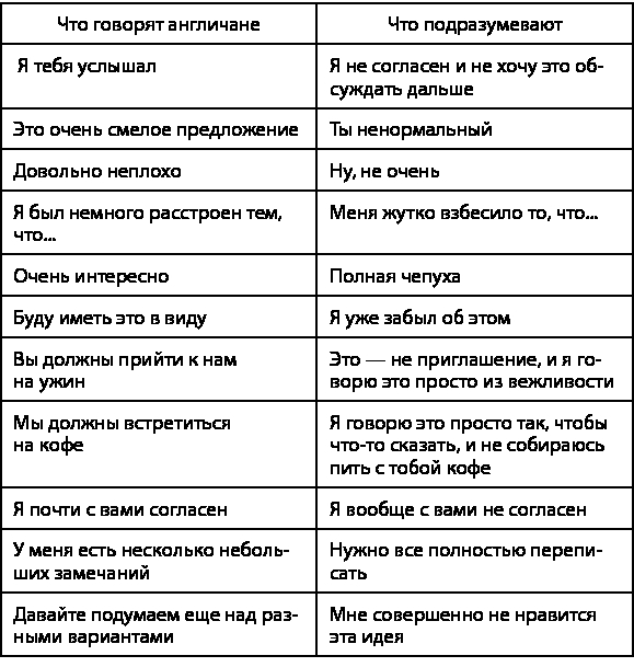 Сами англичане немного смеются над собой и даже придумали табличку, что все эти экивоки означают: