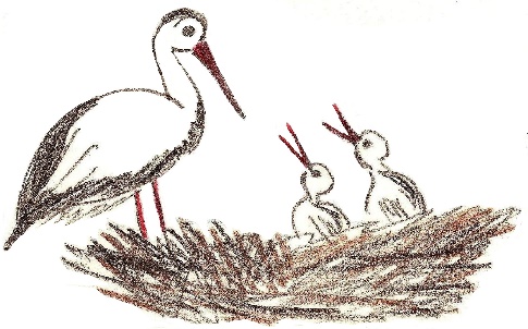 Решение посмотреть, откуда шум, к детям пришло одновременно. Оленька вышла из калитки и направилась за мальчиком, который уже пробирался через кусты и высокую траву к месту, откуда доносились странные звуки. Через несколько шагов на примятой траве они увидели аистенка. А недалеко на высоком столбе было большое гнездо, над которым беспокойно летал аист.
