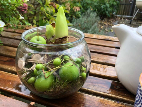 Хотя фактура сегодняшнего неба, говоря по-Бунински, будто специально создана для ворон, чаепитие в саду не отменяется. Более того, приобретает особую феличитабельность в компании трогательного дизайнерского существа, творящего мелодию коинсиденции в мшисто-зеленоватых тонах и ауре наивного, но утверждающе-значительного росткового становления.